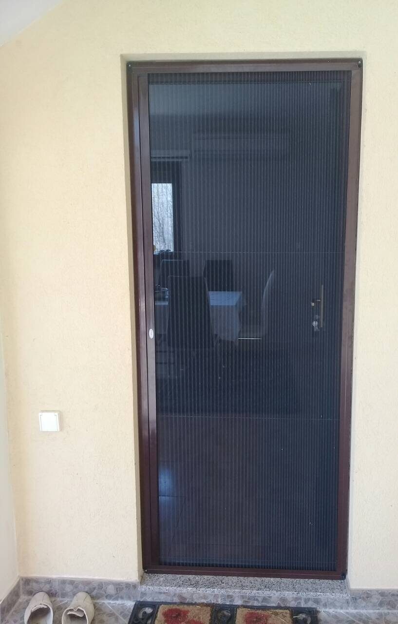 Opening and closing is possible from the outside and inside. Pleated mosquito nets can be installed on all types of doors and do not require a lot of space. The mosquito net frame is made of high-quality aluminum. This, of course, guarantees the long life of this product, and it is resistant to corrosion and does not break. The mosquito net is easy to clean with water.