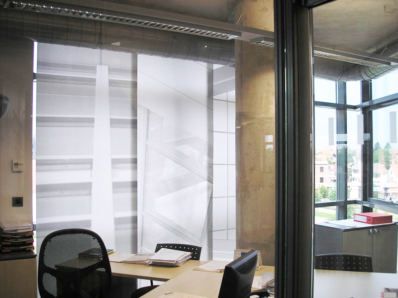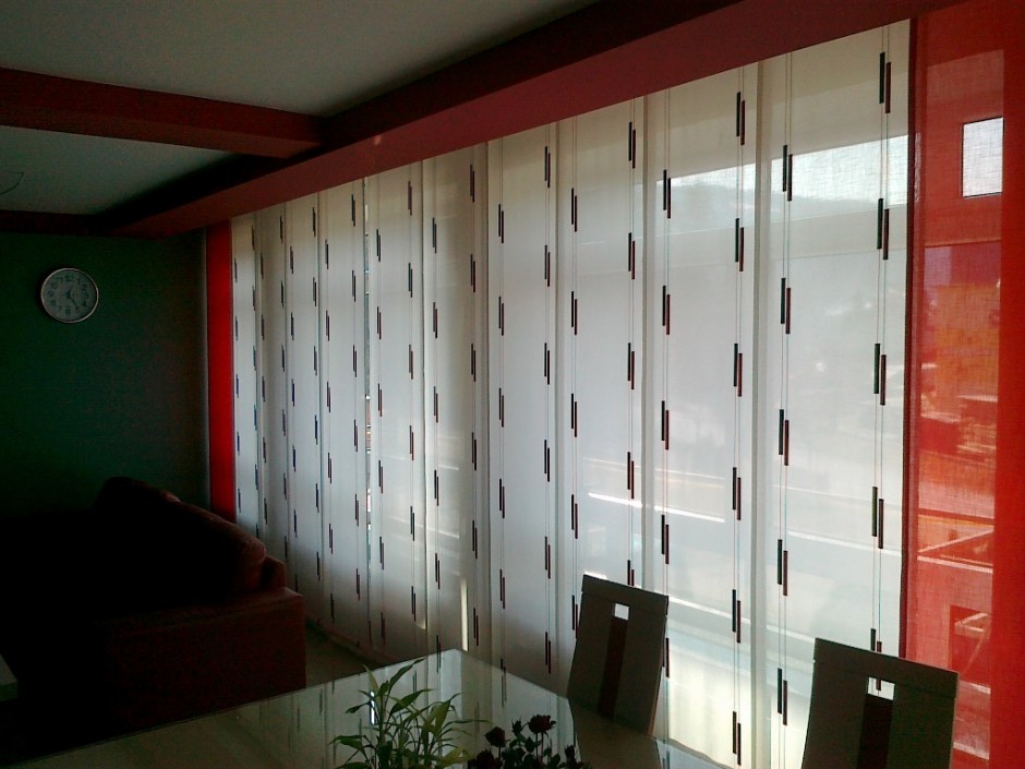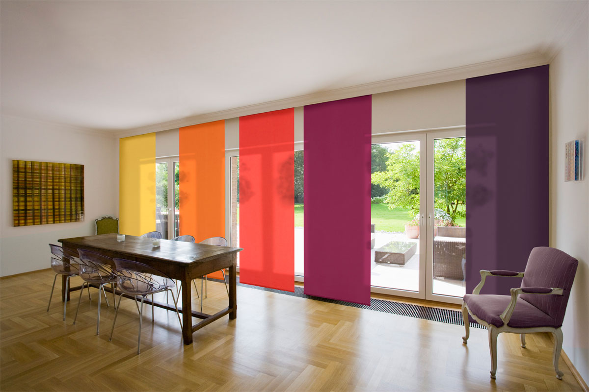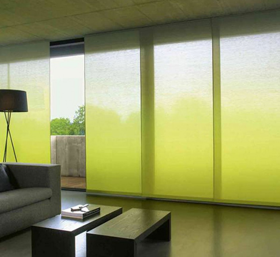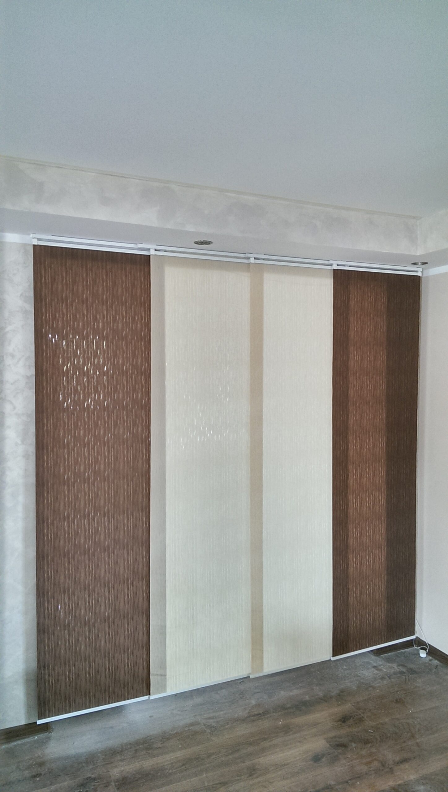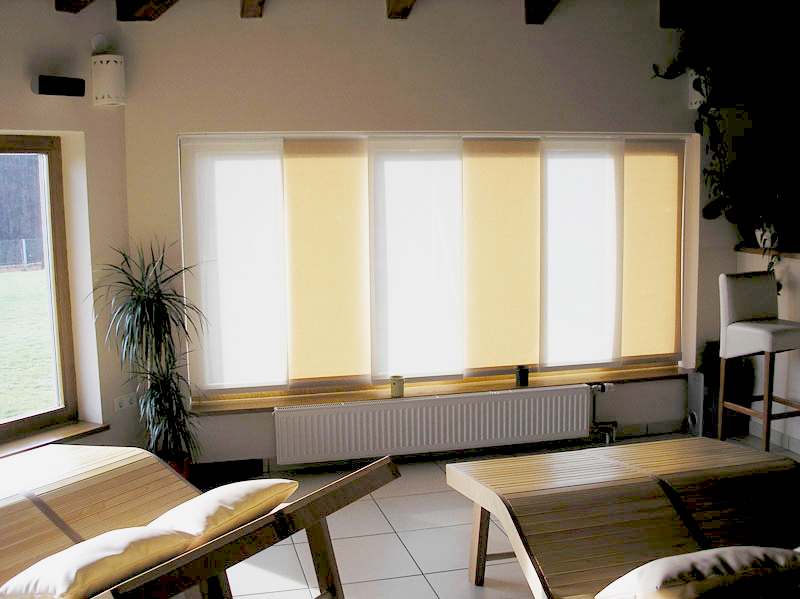 Panel curtains (Japanese wall) are used to cover large openings, wide storefronts, as well as for internal partitioning of rooms. Canvases are made of polyester, are antistatic and antiallergic. They can be made of thinner or thicker materials, transmit light or be opaque, plain, colorful or patterned. The mechanism is made with rails in 3-5 channels, depending on the width of the wall on which it is mounted. They can be collected on one side or on both sides. Panel curtains are also called the Japanese curtain wall.