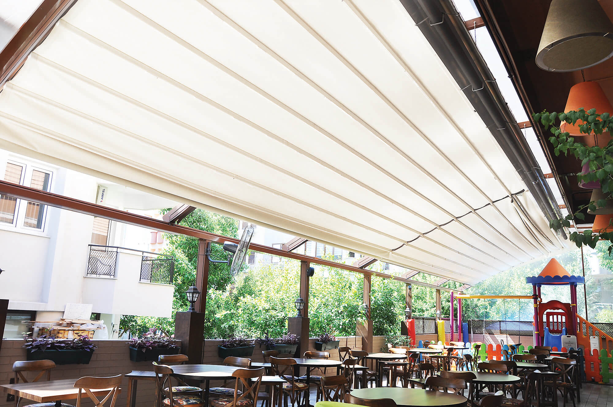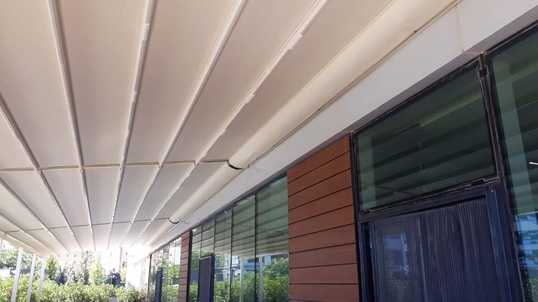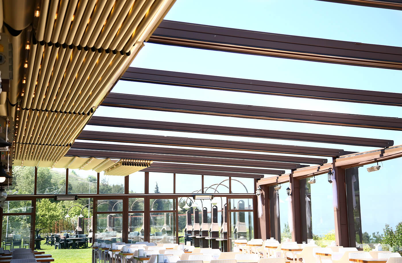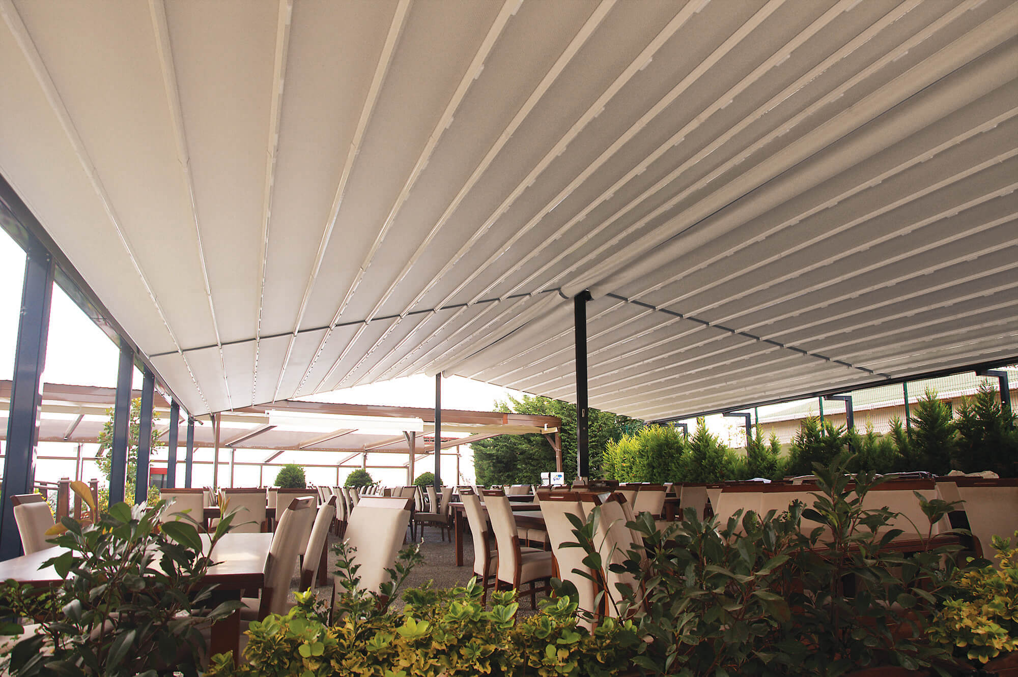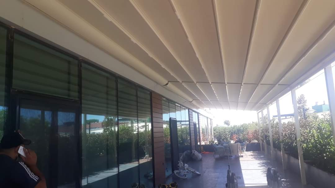 Via an engine and spring mechanism that is integrated into the system, the aluminum panels that make up the ceiling move back and forward and enable you to obtain an open, closed, or semi-open ceiling structure.