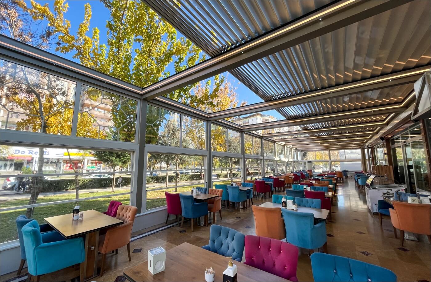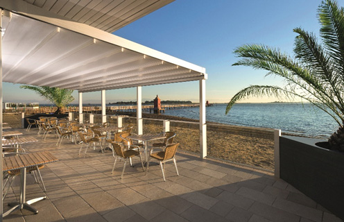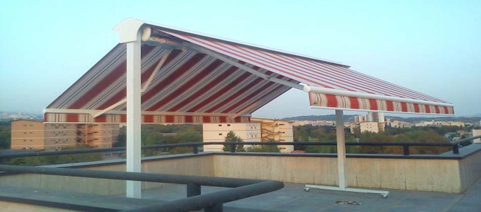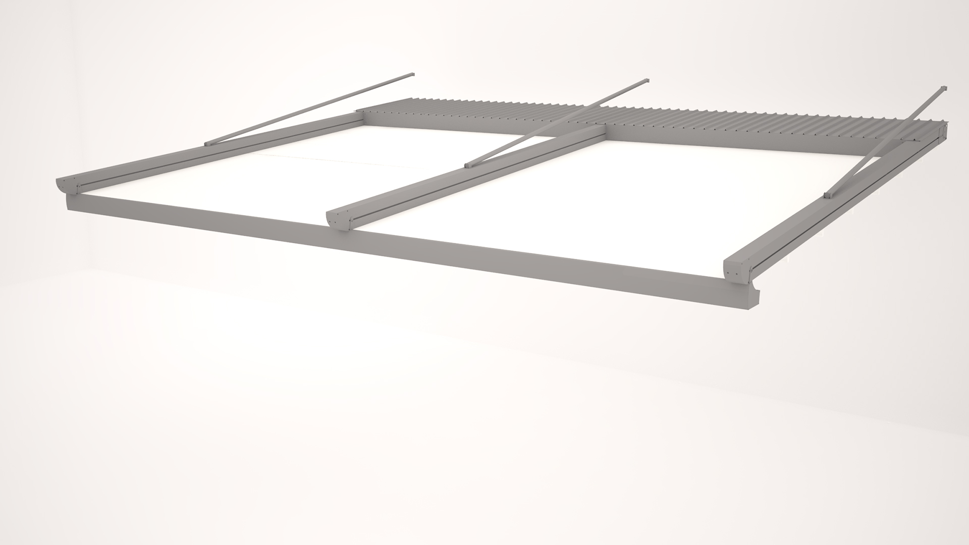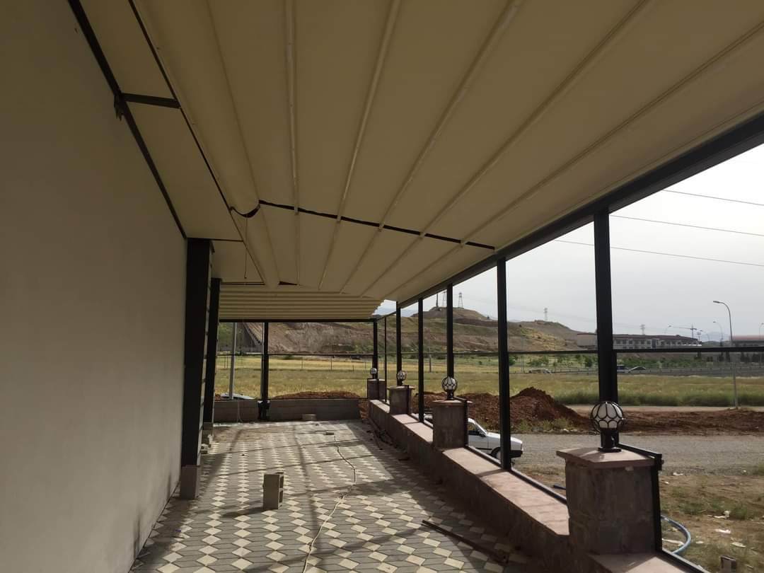 Via an engine and spring mechanism that is integrated into the system, the aluminum panels that make up the ceiling move back and forward and enable you to obtain an open, closed, or semi-open ceiling structure.