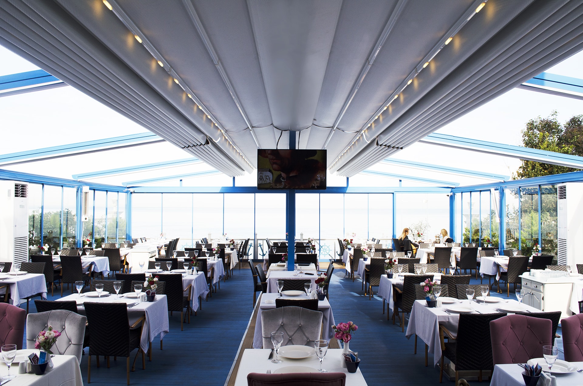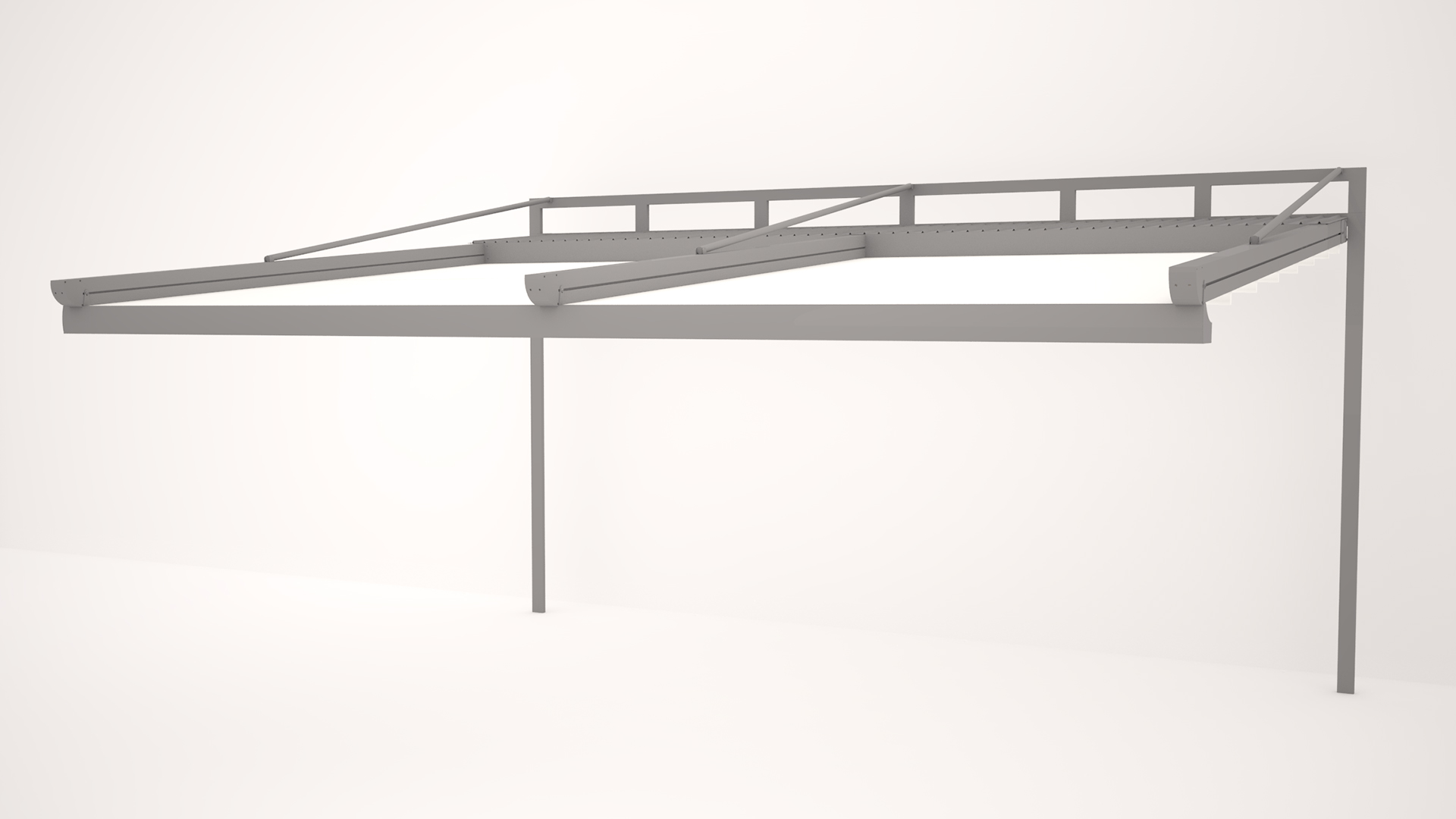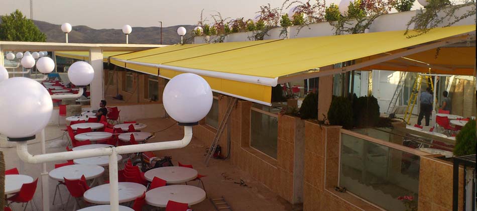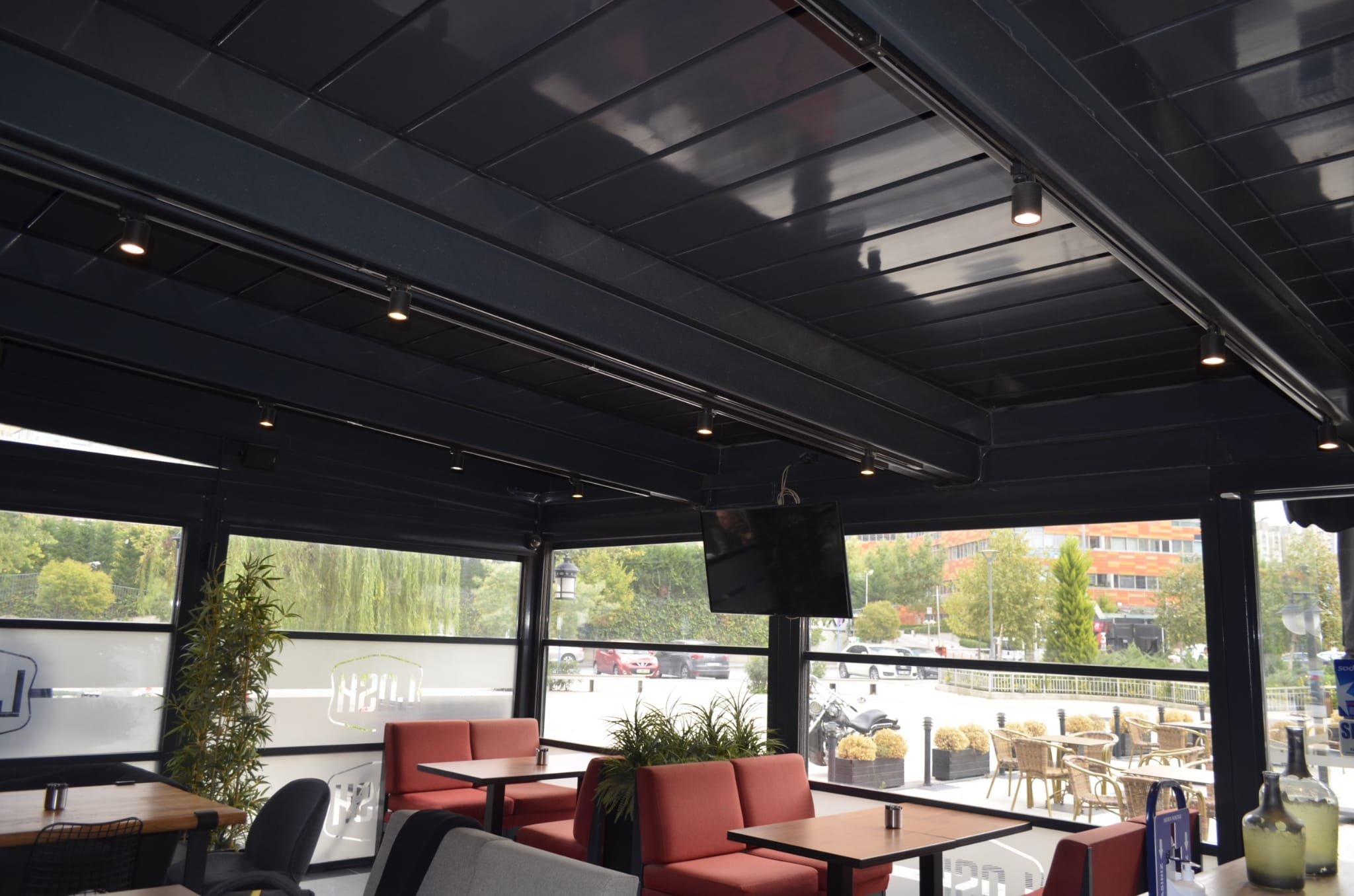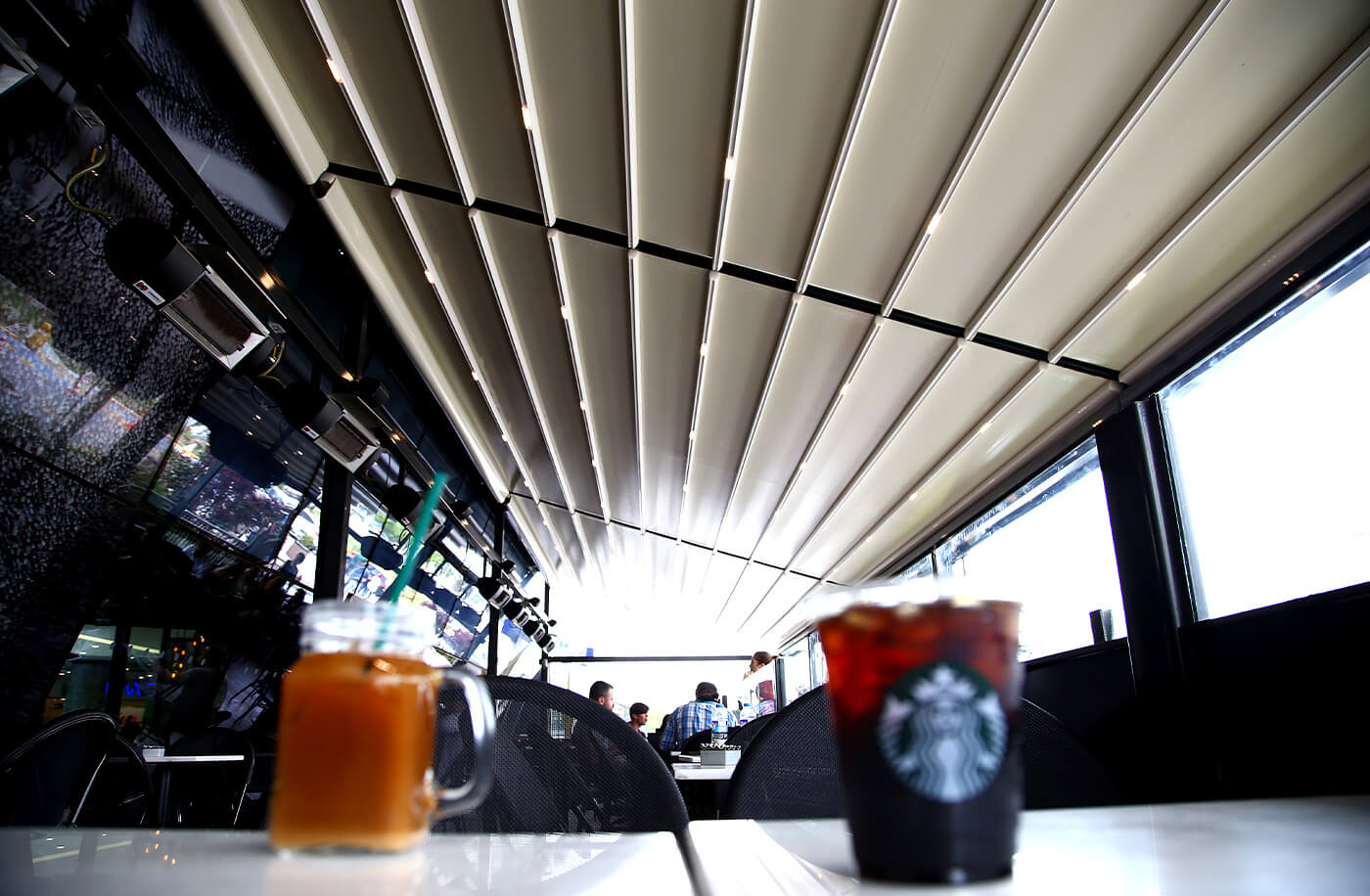 Via an engine and spring mechanism that is integrated into the system, the aluminum panels that make up the ceiling move back and forward and enable you to obtain an open, closed, or semi-open ceiling structure.