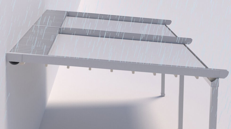 On the frontal pole, the aluminum valley profile, which is placed in a horizontal direction with respect to the product, collects the flowing water with the use of the inclination and transfers it to the outside via its special water drainage.