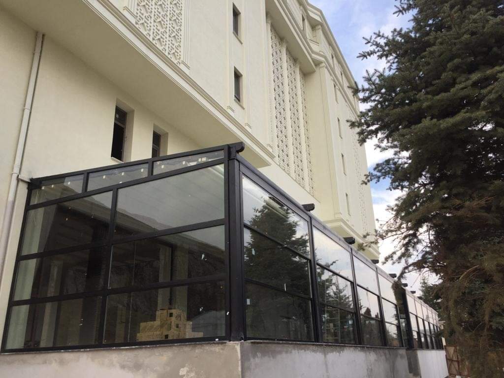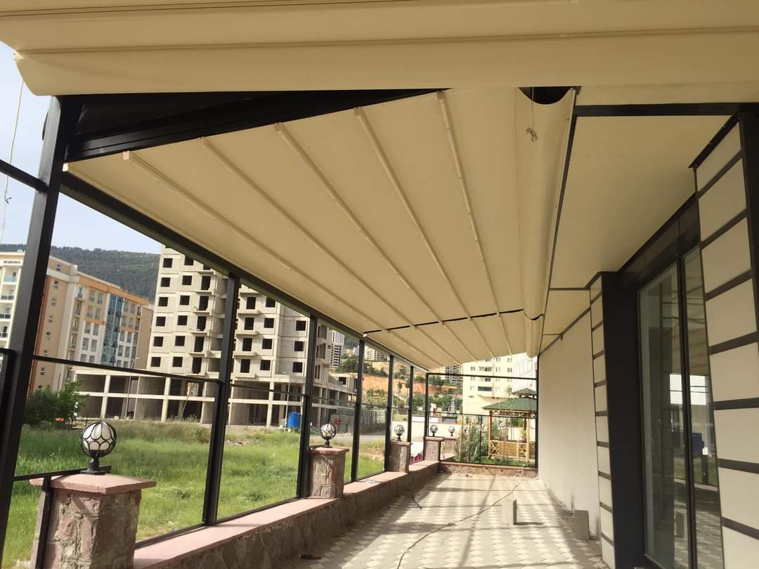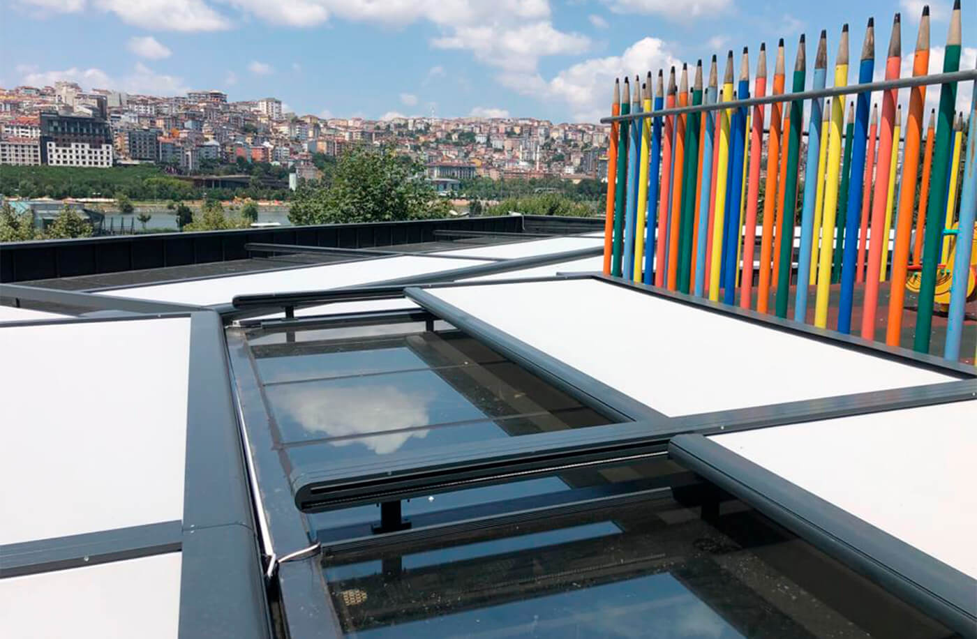 The system is installed on the rail profiles located in the side sections of the glass produced as 2 or 3 wings. The engine box at the top of the system opens and closes the system by means of steel chains and gears.