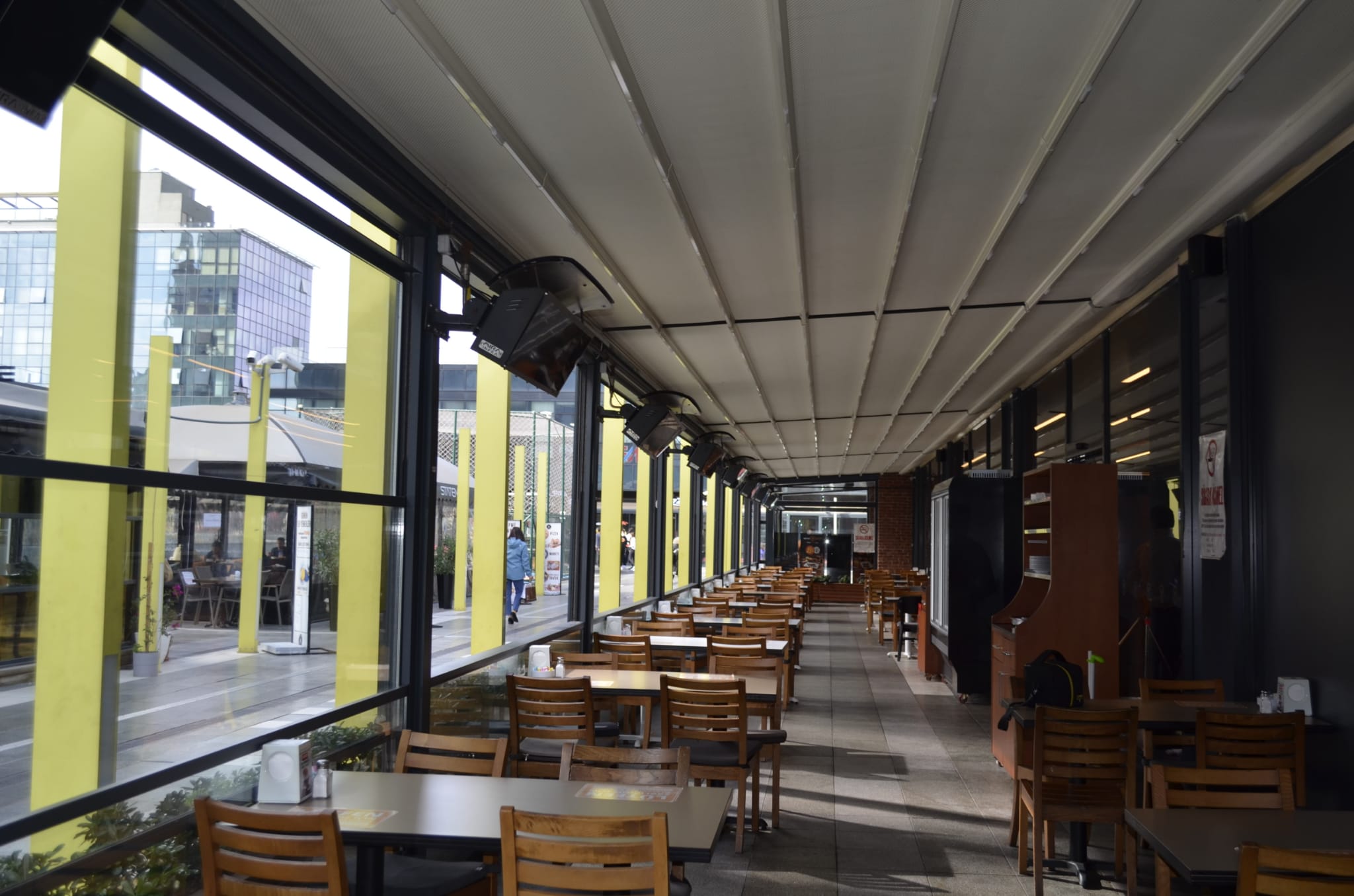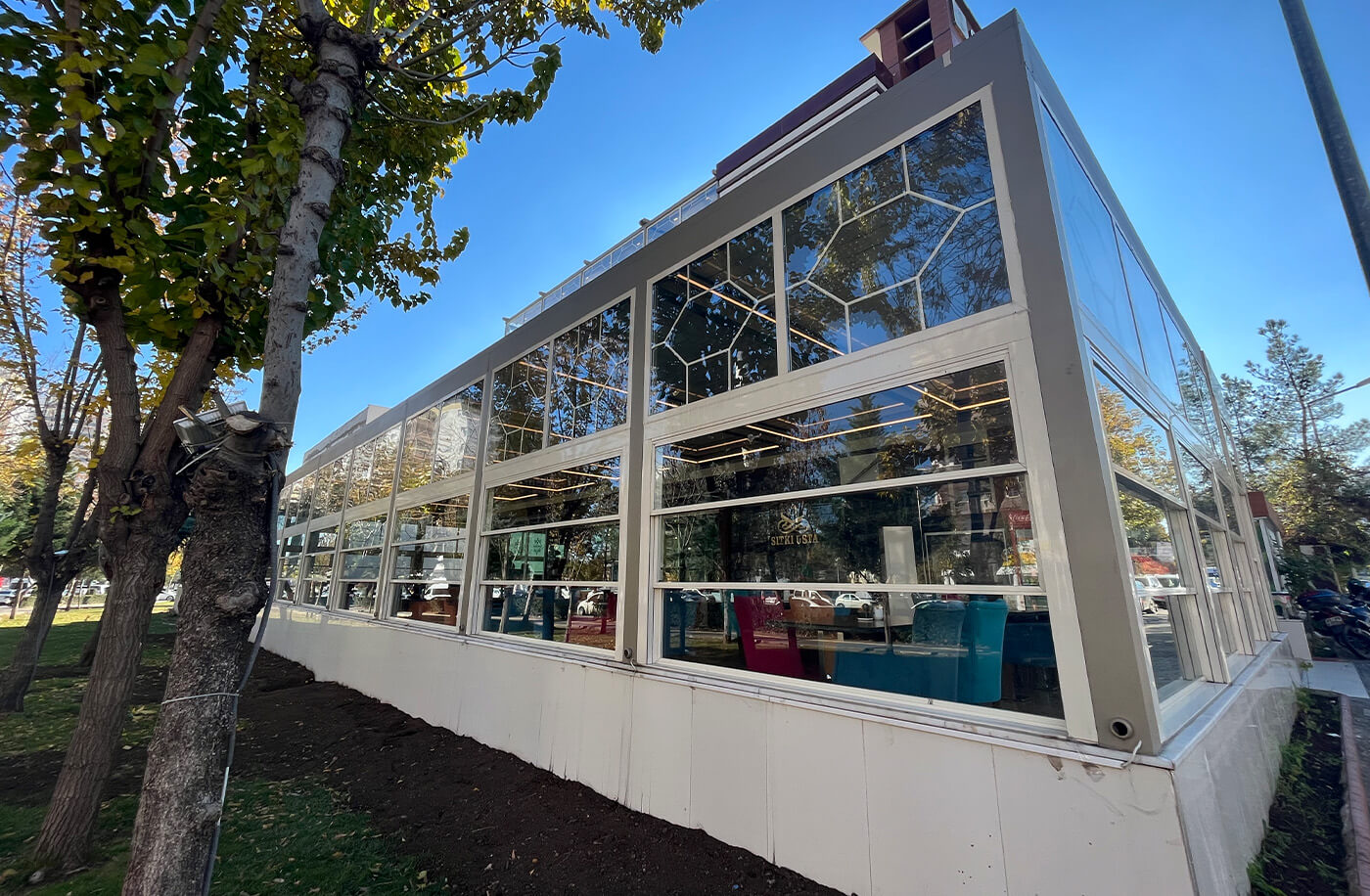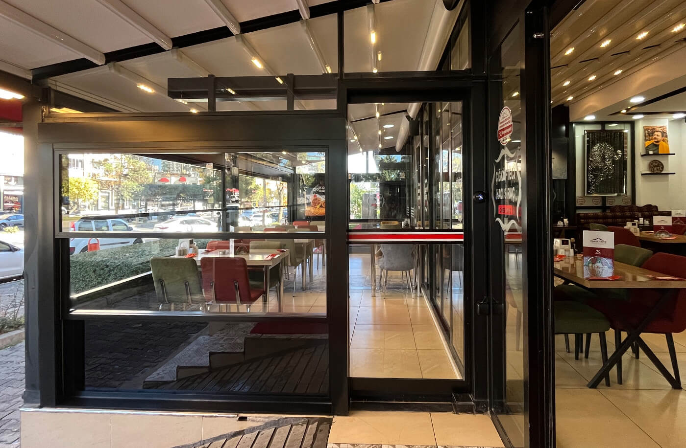 The system is installed on the rail profiles located in the side sections of the glass produced as 2 or 3 wings. The engine box at the top of the system opens and closes the system by means of steel chains and gears.