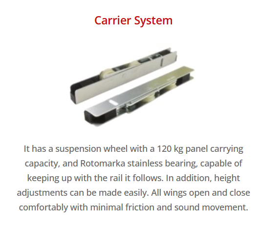The system is installed on the rail profiles located in the top and bottom sections of the glass and produced as minimum 2, maximum 4 wings for the single side movement and minimum 4, maximum 8 wings for the double side movement system. The locking system on the first and last wings gives you maximum safety for your system.
